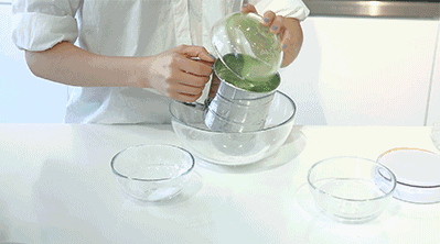 1、制作抹茶蛋糕胚。烤箱預(yù)熱,上下火均為180℃。隨后將低筋面粉、抹茶粉、鹽過篩。