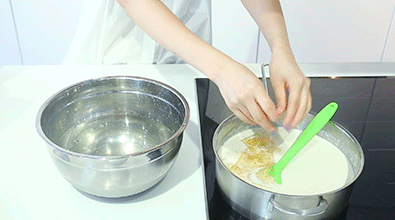 8、制做紅豆奶凍。將牛奶、淡奶油、細(xì)砂糖、蜜紅豆攪拌均勻倒入鍋中,魚膠片在冰水中泡軟后倒入鍋中。將牛奶混合液煮至沸騰,轉(zhuǎn)小火煮30秒后盛入盆中。