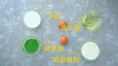 低筋面粉 75g / 抹茶粉 12g / 鹽 少許 / 沙拉油 50g 牛奶 75g/ 蛋黃 75g / 蛋白 175g / 細(xì)砂糖 125g