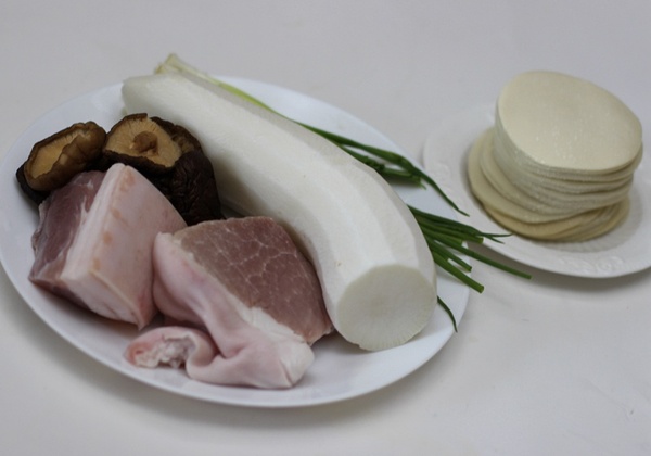白蘿卜 一根、豬肉 300克、干香菇 20克、餃子皮 適量、青蒜苗 三棵、小蔥 兩棵、生姜 一塊、雞蛋 一個、油 適量、鹽 適量、生抽 適量、黑胡椒粉 適量、香油 適量
