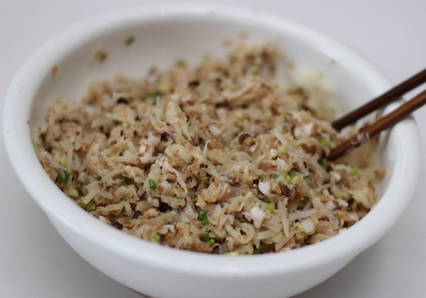 7、將蘿卜絲、肉泥、蔥姜末、香菇末倒一起,打入雞蛋,加入適量鹽、生抽、香油、少許黑胡椒粉,充分拌勻