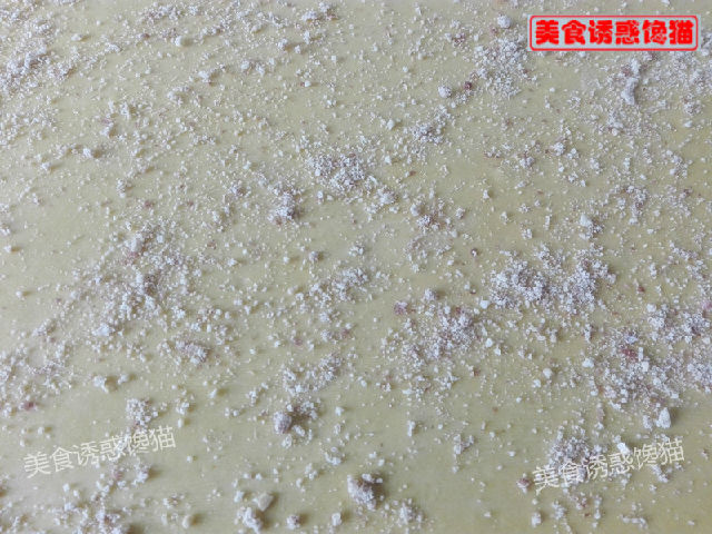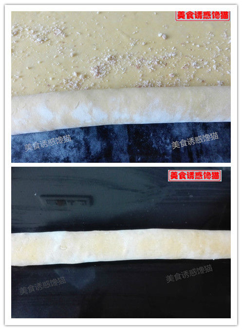 5、將發(fā)酵好的面團搟成一張大面片,刷一層油,撒一層面粉,將油與面粉刷勻,撒一層花生蓉。