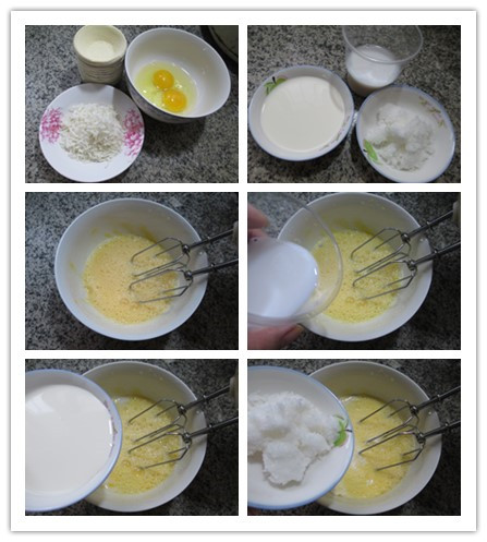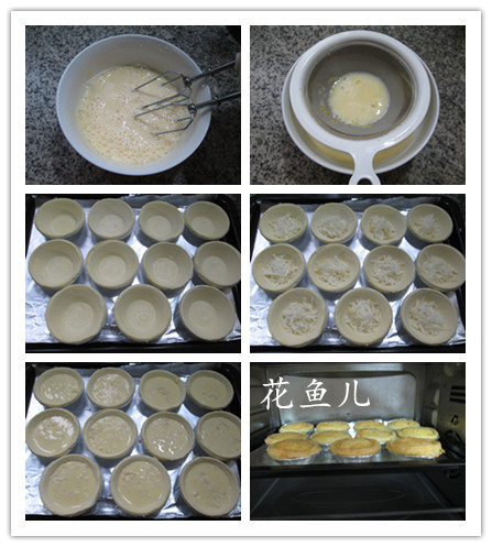 食材:蛋撻皮11個(gè)、椰絲60克、雞蛋2只、椰子汁70克、淡奶油50克、綿白糖30克