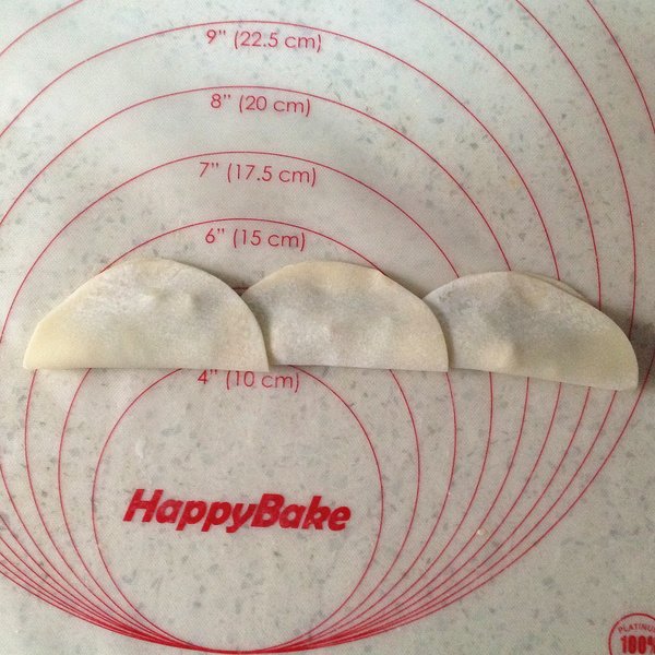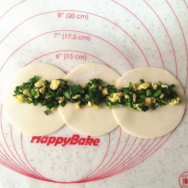 4、把三張餃子皮錯開疊放,放上合適餡料。