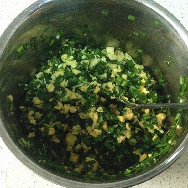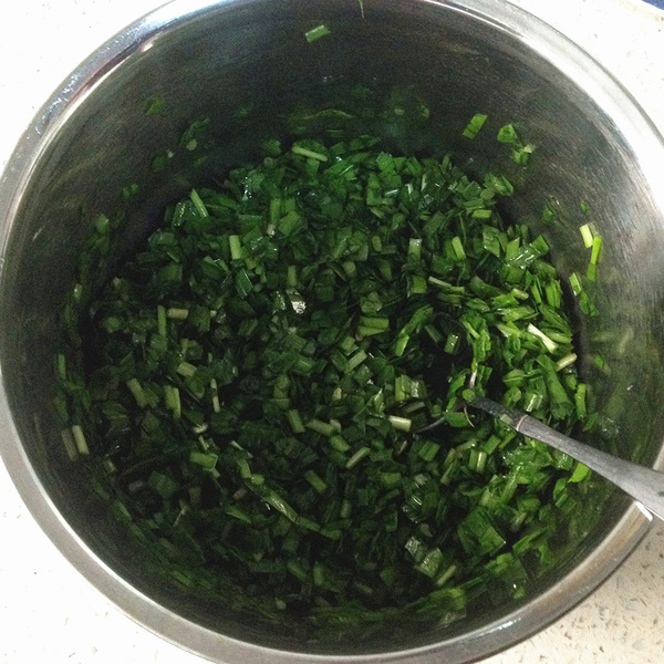 1、韭菜擇凈清洗后控干水份,切碎后加入4勺食用油拌勻,油把韭菜的切面都封住可以避免韭菜出水。