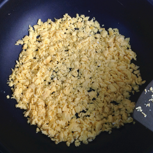 2、四個雞蛋在碗中打勻下鍋炒熟并壓碎。