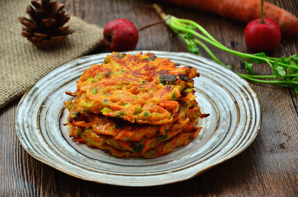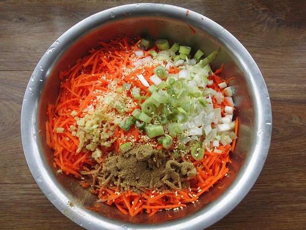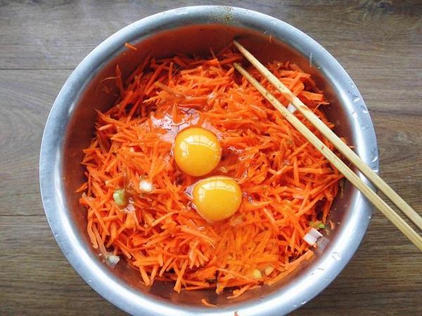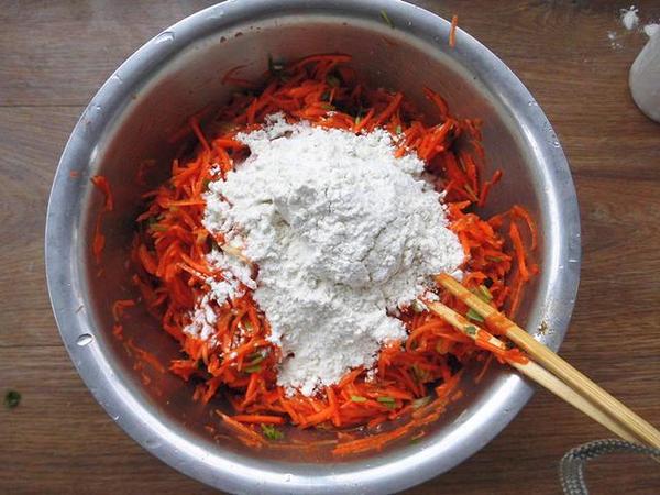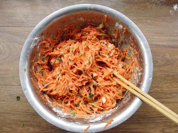 胡蘿卜 三四個 面粉 100克 香菜 2顆 雞蛋 兩個 蔥 一顆 姜 適量 油 15克 鹽 一勺 雞精 一勺 五香粉 一勺 雞汁 一勺