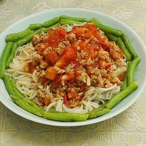6.把番茄肉末汁淋面上,用豆角圍邊即可