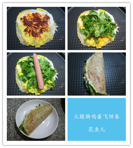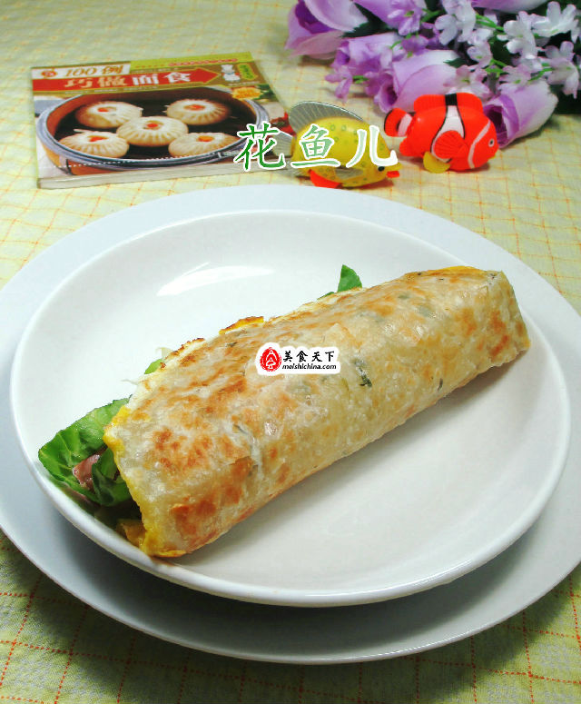 (4)最后,合入已切好的生菜和火腿腸卷起來,即成。