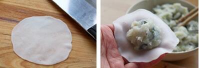 餡料:鱈魚150克、蝦仁200克、蔥10克、姜5克、米酒2湯匙、淀粉1茶匙、蔥油(或香油)10-15克、鹽和胡椒粉適量
