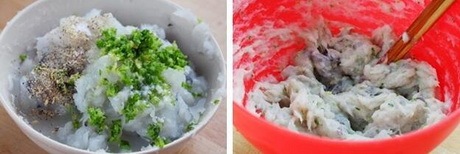 5.將蝦肉和魚肉放在碗里加鹽2克和淀粉1茶匙抓甩幾下入味起黏,然后加入蔥末10克、姜末5克、糖1克、胡椒粉0.5克、米酒1-2湯匙。