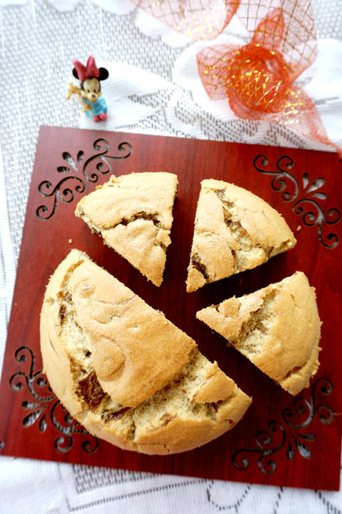 倒入六寸圓模。震平表面。放入烤箱,中下層,上下火150度,烤約40分鐘左右。出爐后立即倒扣。冷卻后翻面。脫模,切塊食用。