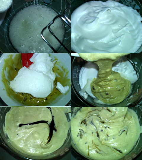 蛋白攪打成粗泡,分三次加剩下的糖攪打。成9分發(fā)狀態(tài)。取三分之一蛋白到蛋黃糊中,拌勻。倒回蛋白中,拌勻。將肉桂糖漿灑在面糊表面。隨意劃拉幾下。