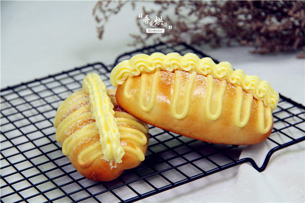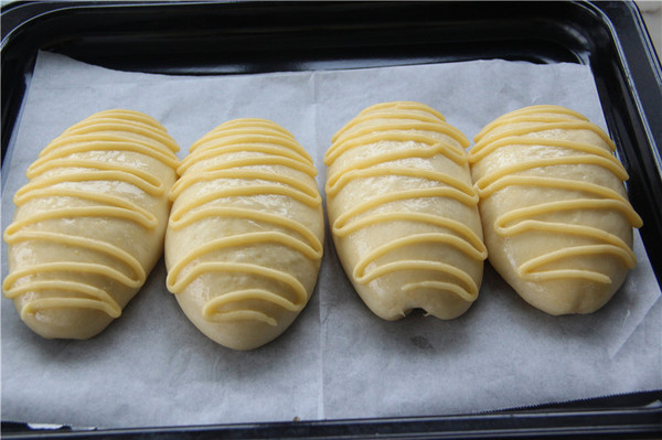 11、做好的泡芙裝入裱花袋,擠在已經(jīng)二發(fā)好、表面刷了蛋黃液的面包面上(如圖)