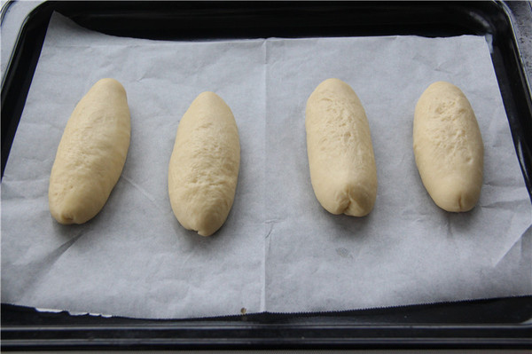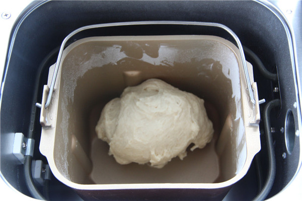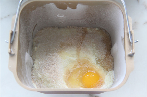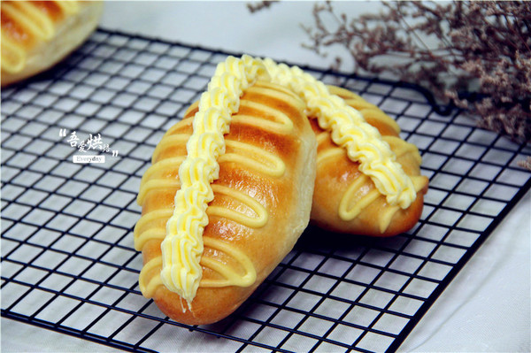 面包胚材料:高粉235克、奶粉3克、細(xì)砂糖28克、鹽2克、水124克、雞蛋35克、酵母3克、黃油25克