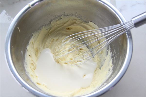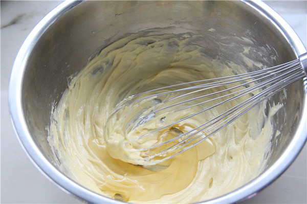 15、拌勻后再分次加入淡奶油(無(wú)需打發(fā)),攪勻后裝入安好花嘴的裱花袋中