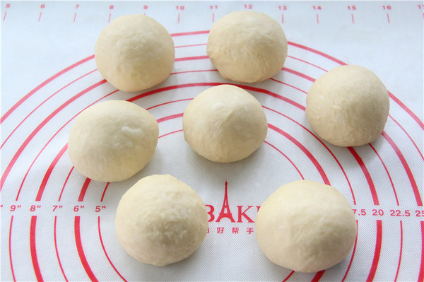 5、將面團(tuán)排氣,再揉圓放室溫靜止15分鐘松弛醒發(fā)面團(tuán);醒發(fā)好的面團(tuán)平均分成7等份或8等份