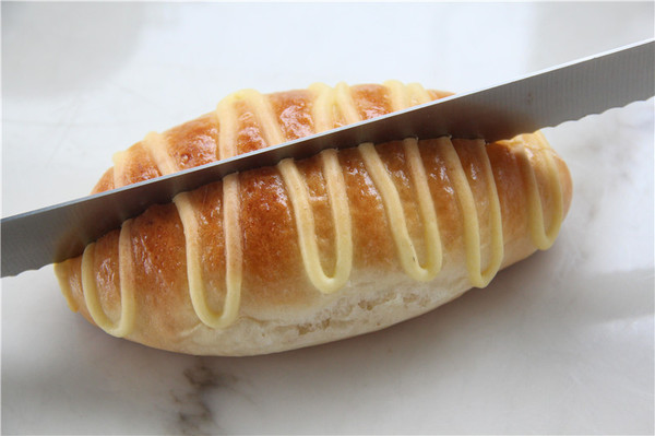 16、烤好的面包出爐待涼后用鋸齒刀在中間豎著切開(kāi),不要將底部切斷