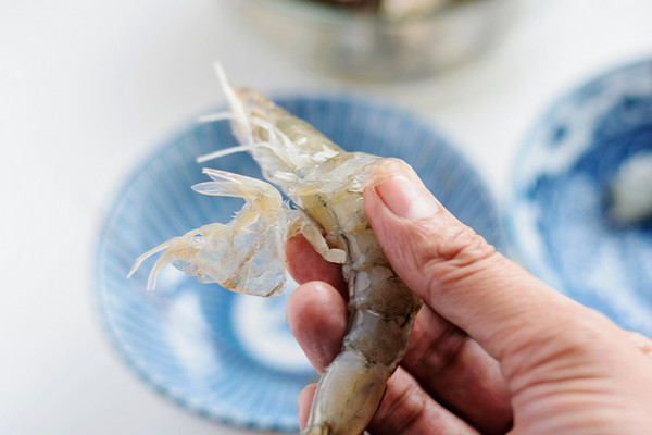 3、新鮮海蝦剝?nèi)ノr殼,剔除蝦腸蝦線(xiàn)。