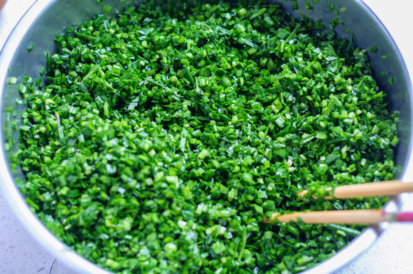 6、把晾干的韭菜切碎。韭菜晾干可減少餃子餡出水。