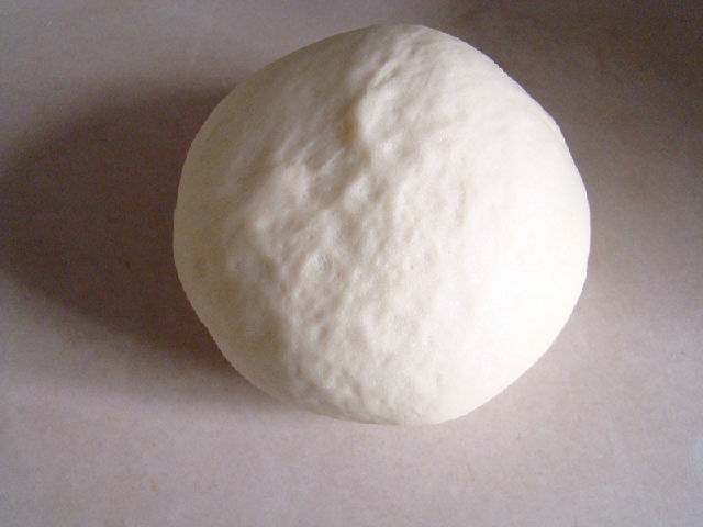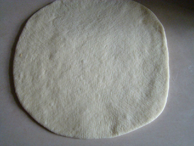 5,發(fā)酵好的面團排氣滾圓后搟成比9寸披薩盤略大的圓片。