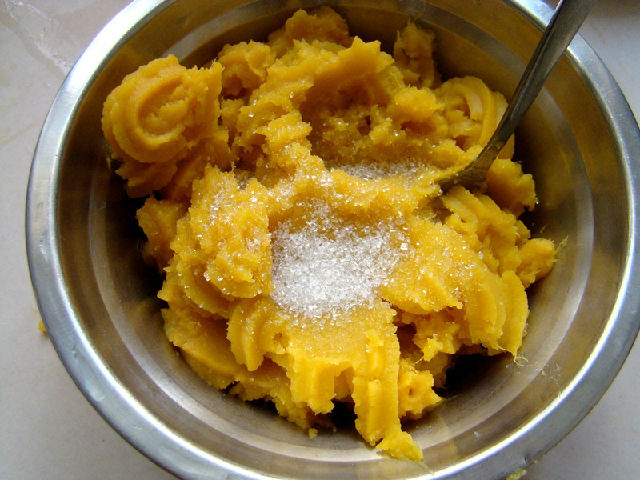 3,取約250克攪成泥,并加入適量細砂糖攪拌均勻。