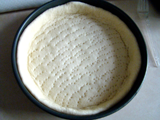 6,放入披薩盤中,用叉子在上面叉上小孔,以止烘烤時隆起。