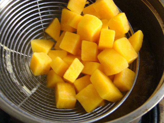 4,另取一塊生紅薯去皮切小塊,煮熟,撈出瀝凈水備用。