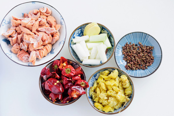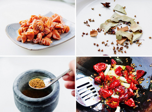 4、炒鍋里倒入油,放進(jìn)麻椒里、生姜片、蔥白、燈籠椒用小火煸炒。