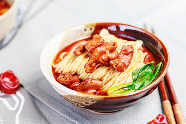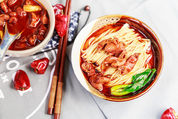 [材料]:手搟面250g、熟肥腸300g、油25g、雞湯500g、麻椒1/2茶匙、八角3個、花椒1茶匙、大蔥1根、生姜1小塊、香葉適量、桂皮適量、燈籠椒適量、泡椒適量、郫縣豆瓣醬3湯匙、白糖3茶匙、面醬2湯匙、陳醋3茶匙