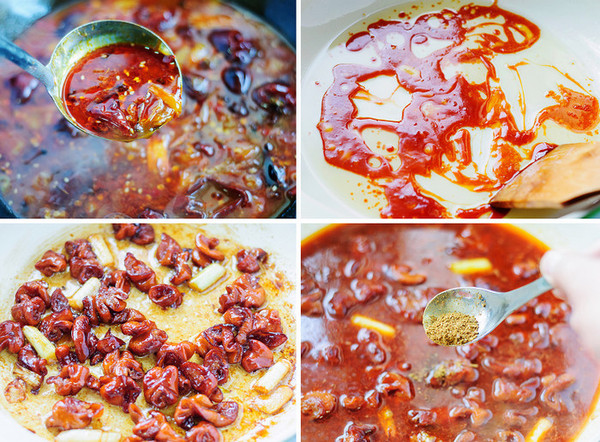 5、放進(jìn)郫縣豆瓣醬、面醬用小火炒出紅油。倒入雞湯或豬骨湯,放入泡椒大火煮開。