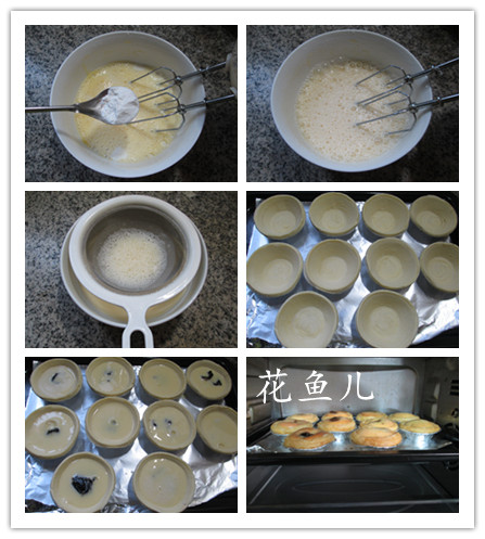 食材:蛋撻皮10個、桂圓肉60克、雞蛋2只、牛奶70克、綿白糖10克、煉乳、低筋面粉5克