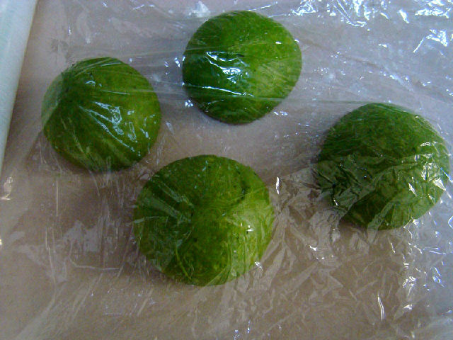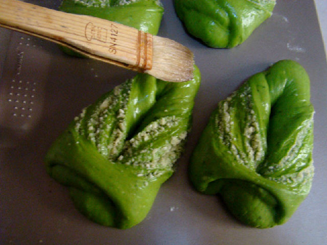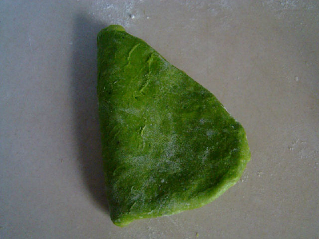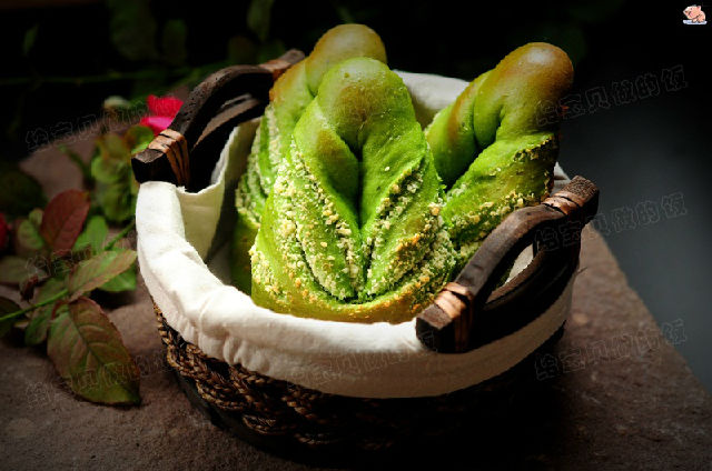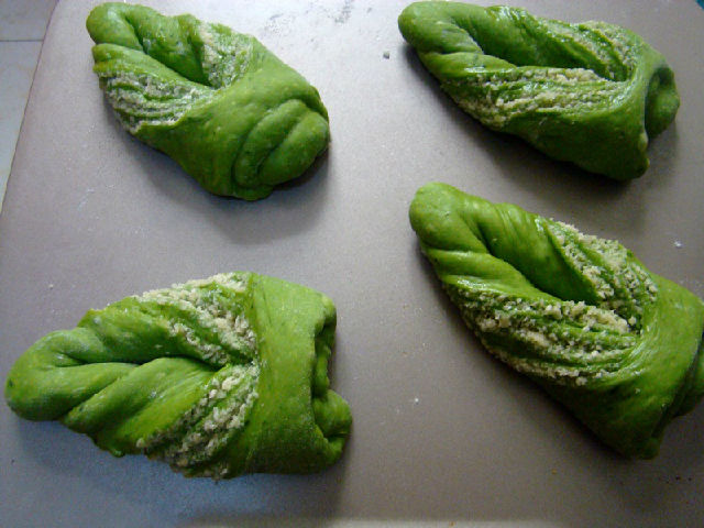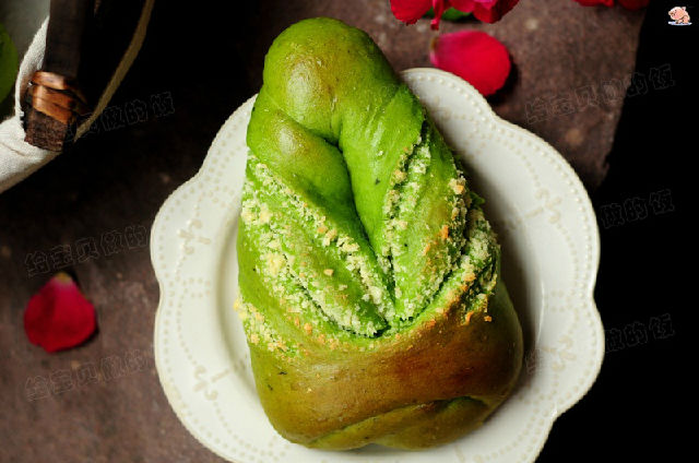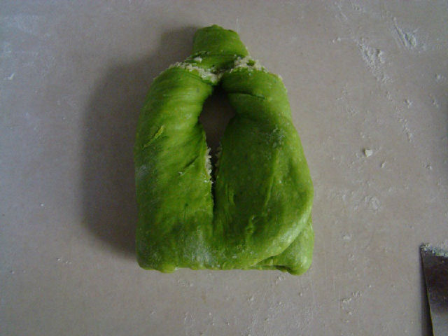 面團(tuán)原料:高粉200克,細(xì)砂糖35克,鹽1/4小匙,蛋液35克,酵母粉3克,菠菜汁100克,黃油15克