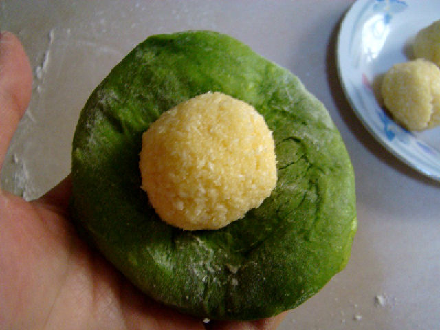 椰蓉餡料:椰蓉35克,細(xì)砂糖20克,黃油18克,奶粉8克,蛋液25克