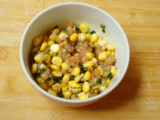 2.餃子餡:豬瘦肉300克、玉米200克、香蔥50克、生粉5克、橄欖油3ml、鹽3克、生抽2ml