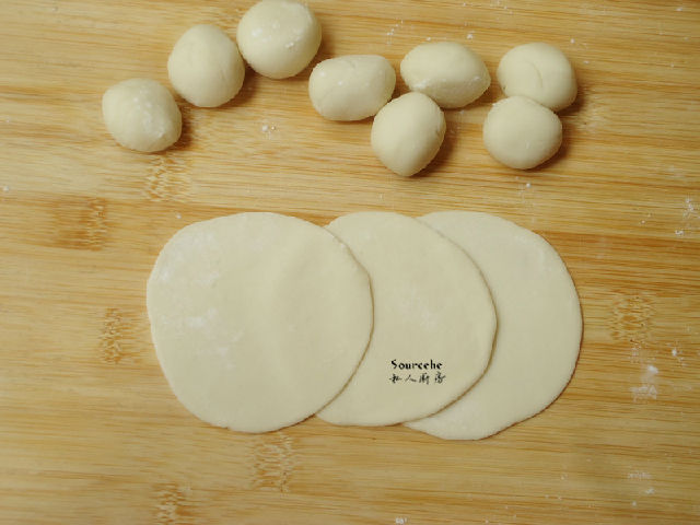 5.用搟面杖把面團搟薄成餃子皮;