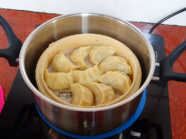 11.鍋中清水煮沸,把餃子蒸籠放入,蓋上蓋子;
