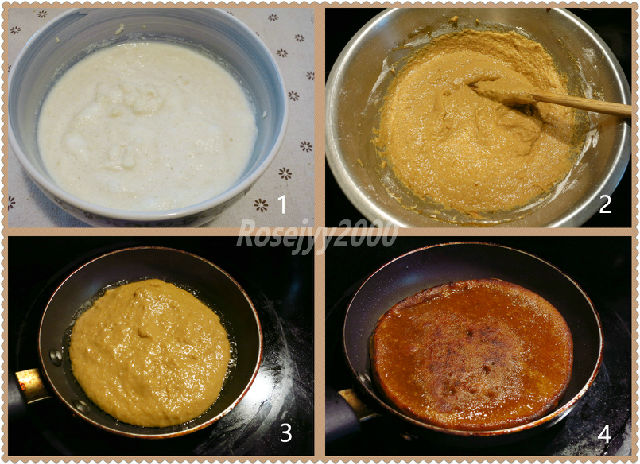 三、用一個約4.5英寸直徑的迷你平底鍋置爐上,中火,放油約1/2茶匙,用鍋鏟或毛掃輕掃均勻,倒入面糊,煎至面糊凝固和微焦;