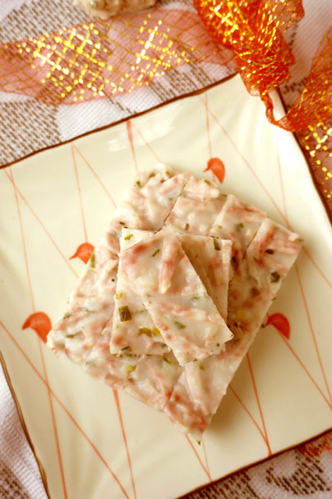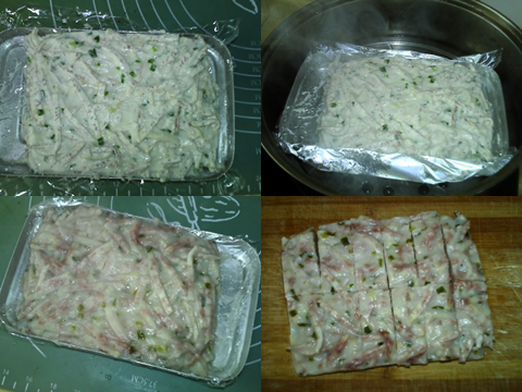 倒入抹油的模具中,鋪平。放入沸水鍋中,大火蒸20-30分鐘。熟透,出鍋。冷卻后切塊。