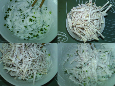 將米粉與太白粉混合過篩,加入胡椒粉,鹽,糖拌勻。加入油拌勻。一邊攪拌一邊沖入開水。攪拌成均勻糊狀。加入蔥花,拌勻。芋頭洗凈去皮,切成絲。倒入米糊中。拌勻。