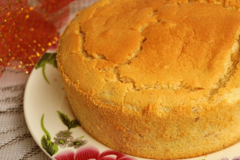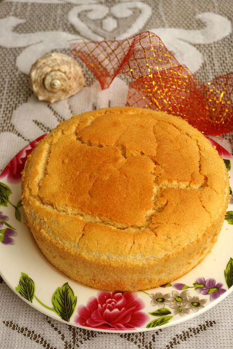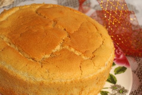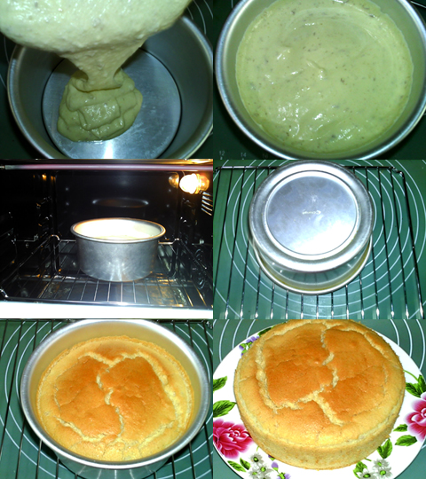 倒入六寸活底圓模中。震平表面。放入烤箱,中下層,上下火135度,烤約40分鐘左右。出爐后立即倒扣,冷卻后翻面。脫模。