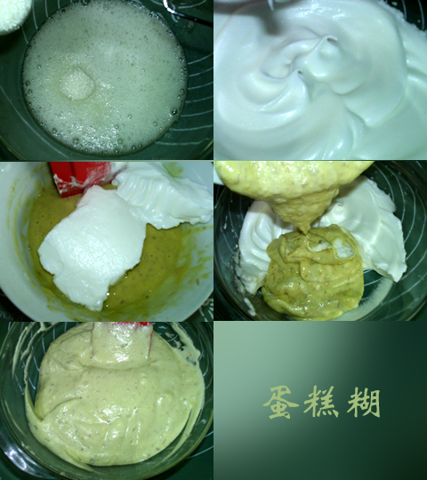 蛋白攪打成粗泡,分三次加入剩下的糖攪打。成為偏硬性發(fā)泡的狀態(tài)。取三分之一蛋白到面糊中,拌勻。倒回蛋白中,拌勻。