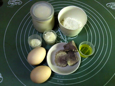 用料:雞蛋2個(gè),蒸熟香芋45克,酸奶42克,細(xì)砂糖33克,玉米油15克,低筋粉38克
