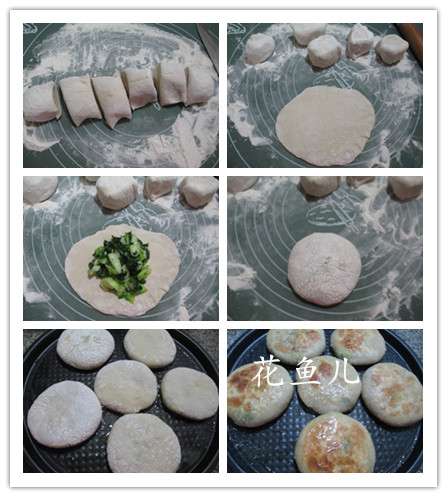 (6)然后,在硅膠墊撒上一些面粉,取和好的面團(tuán)揉勻分成6份,用搟面杖搟開(kāi),放上炒好的手捏菜包好,稍微按扁一下。