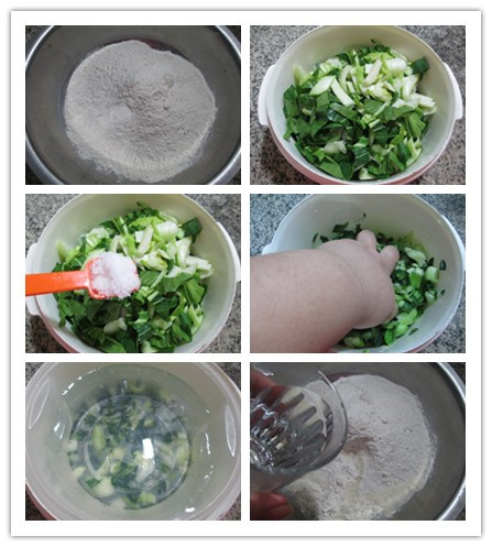 做法:(1)在已洗凈切碎的青菜中加入1小勺半鹽、用手捏一捏,用裝入清水的保鮮盒壓上,腌制30分鐘。