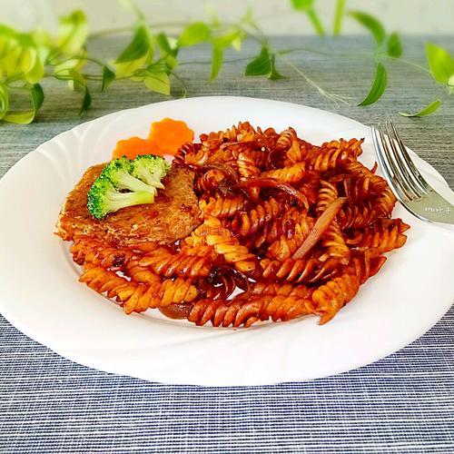 螺絲意大利面(100克) 黑椒碎(適量) 鹽(適量) 紅酒(適量) 黑椒汁(適量)