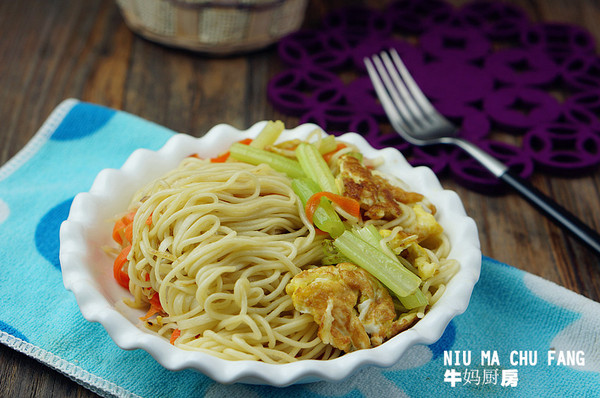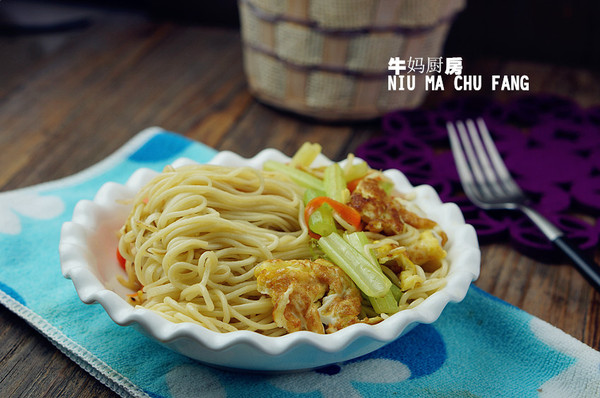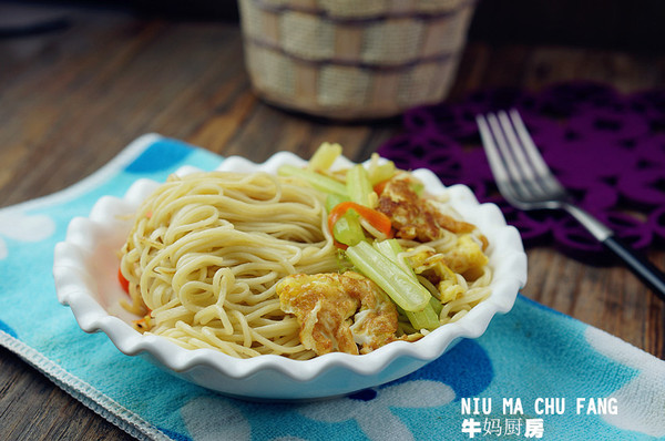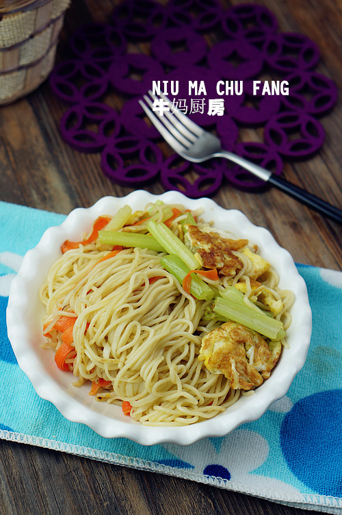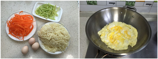 備料:胡蘿卜半個(gè),芹菜適量(換成蔥更好),雞蛋3個(gè),熟面條1份