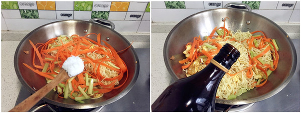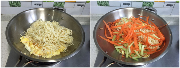二:劃散蛋后加入面條,再加入胡蘿卜及芹菜。