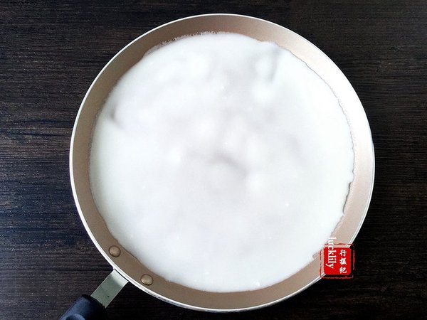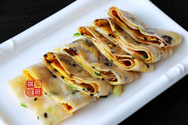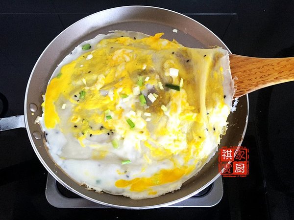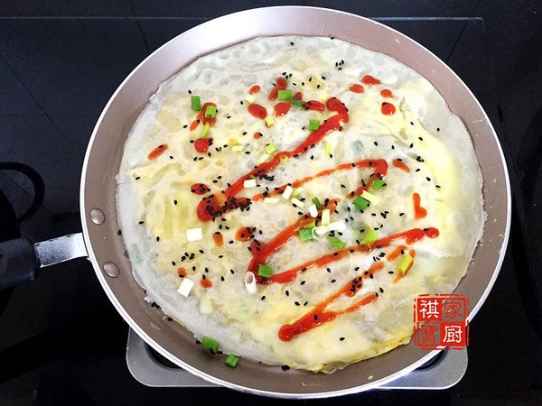 鍋底抹上一層極薄橄欖油,微微加熱后倒入面粉糊,轉(zhuǎn)動不粘鍋,使面糊均勻鋪開;