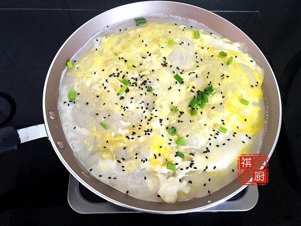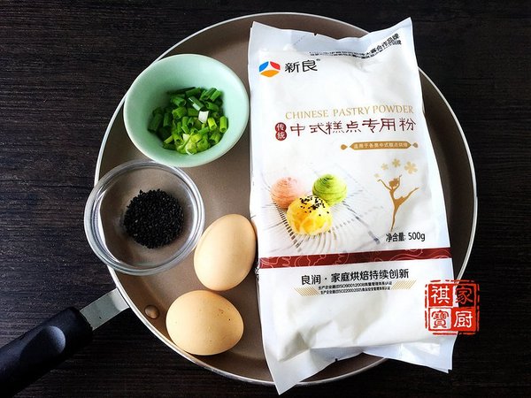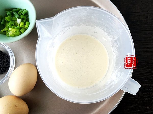 材料:橄欖油、雞蛋、面粉、芝麻、蔥花、番茄醬;